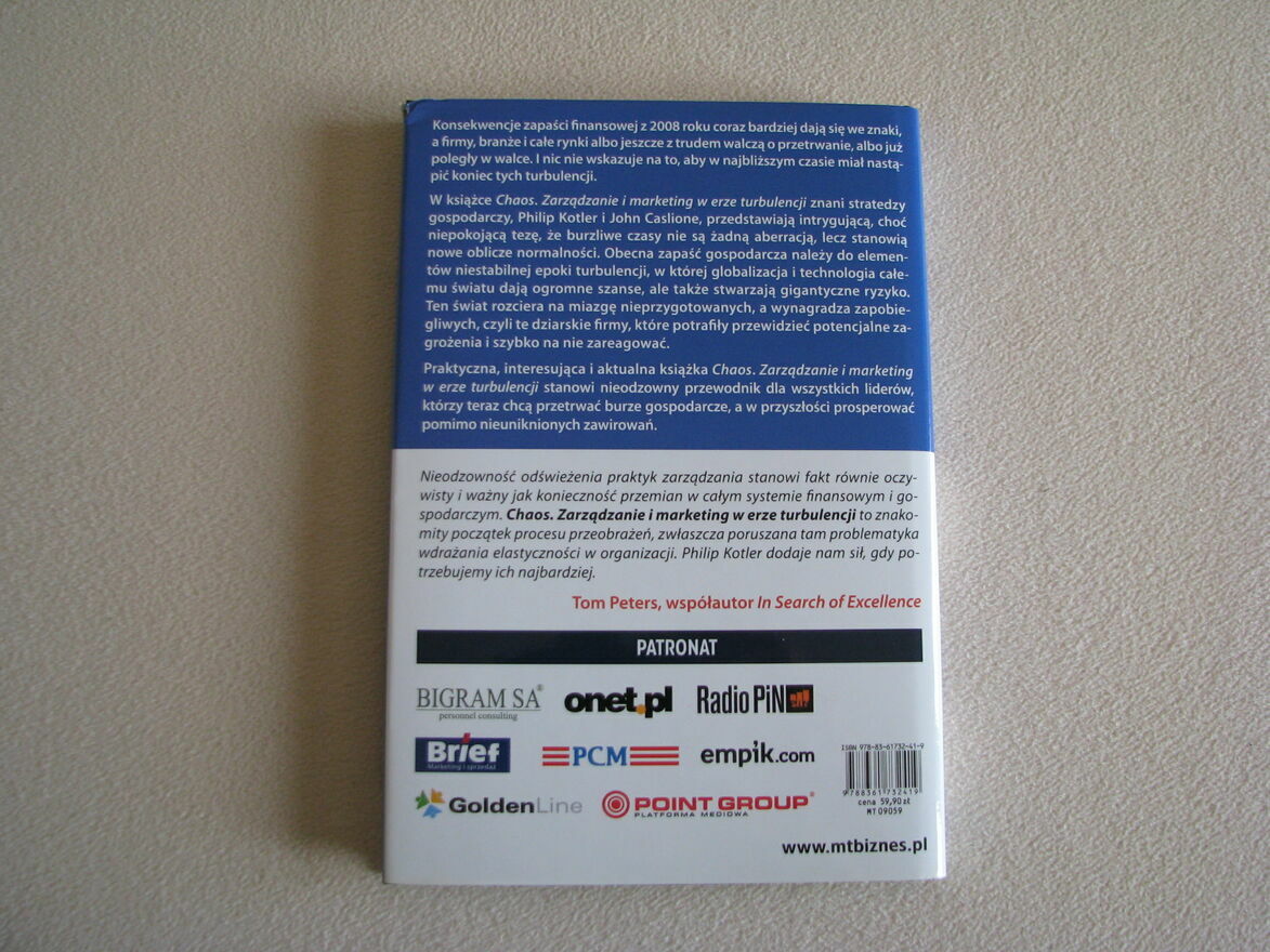Witam,Sprzedam książkę Philipa Kotler i John A. Caslione „Chaos. Zarządzanie i marketing w erze turbulencji”, wydaną w 2009 r przez wydawnictwo MT Biznes.
