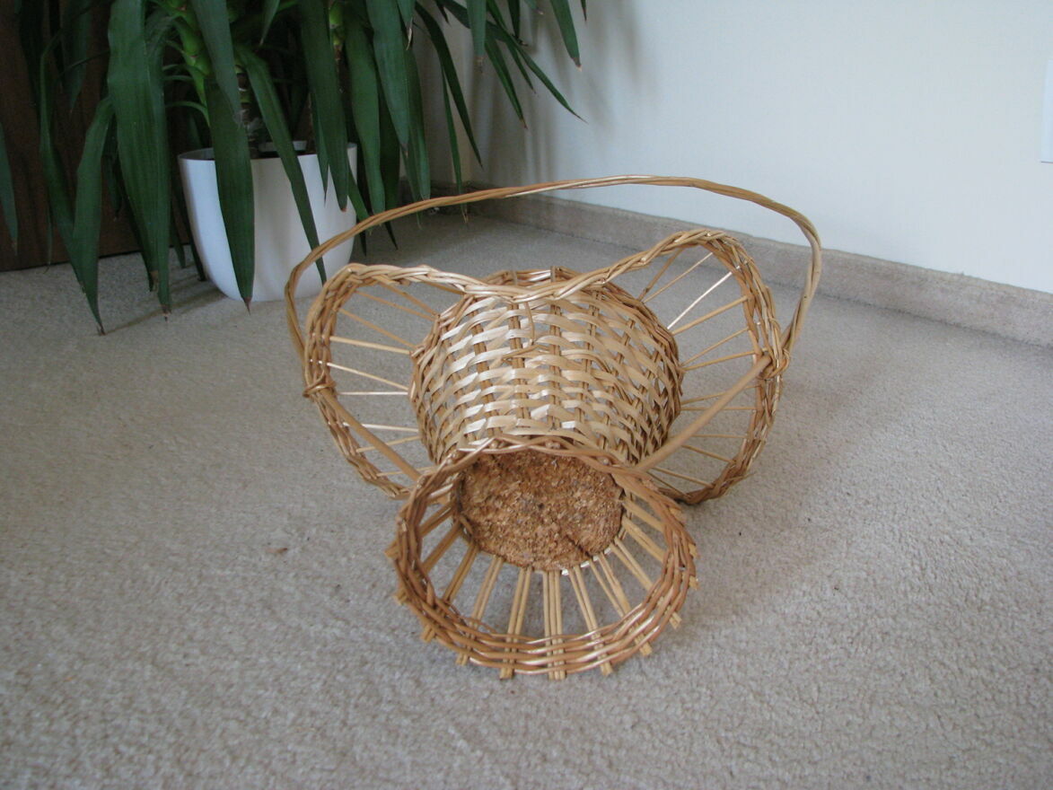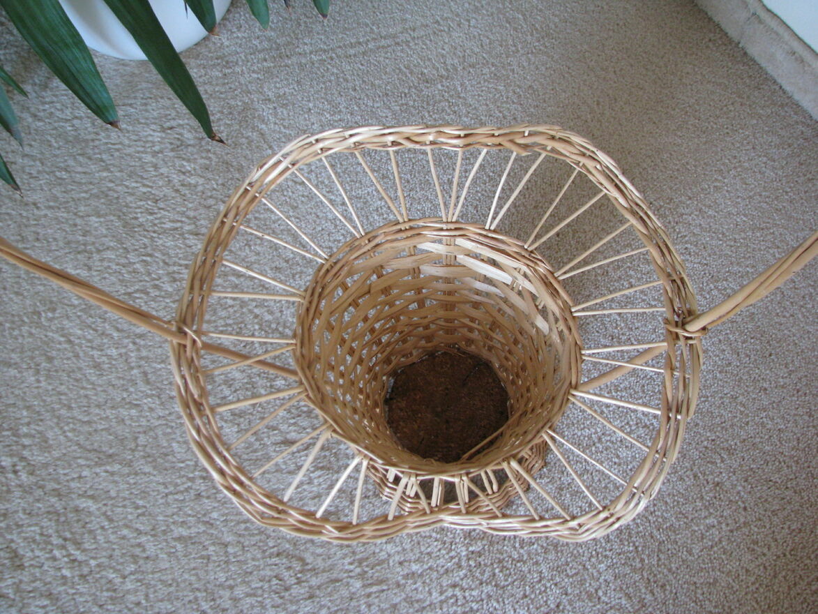 wymiary samej osłonki bez plecionego obrzeża: wysokość 16 cm, średnica u góry 20 cm, średnica spodu 11 cm.