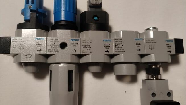 Jest to zestaw elementów pneumatycznych, w tym filtra-reduktora ciśnienia (LFR-1/4-D-MINI) oraz zaworu odcinającego ...