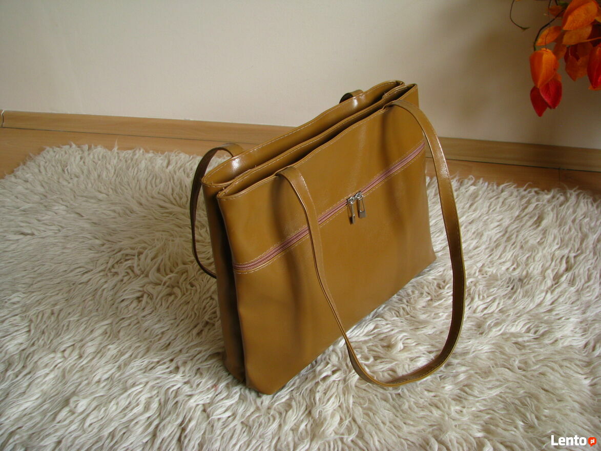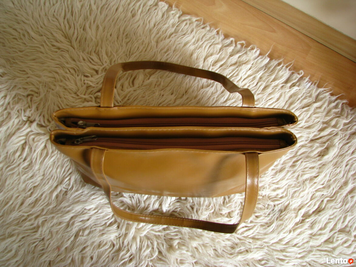 Witam,Sprzedam wygodną, średniej wielkości torebkę damską, wykonaną z matowo połyskującej skóry ekologicznej w kolorze ciepłego brązu. Wnętrze wyłożone jest jasną podszewką w kolorze beżowym, dzięki której lepiej widać zawartość torebki.