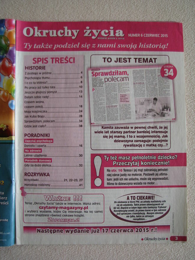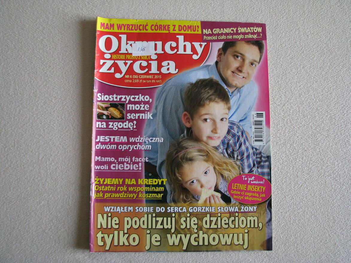 Witam,Sprzedam archiwalne wydanie magazynu „Okruchy życia. Historie prosto z serca” nr 6 z czerwca 2015 r. Format 27 x 20,5 cm, pismo zawiera 44 strony.