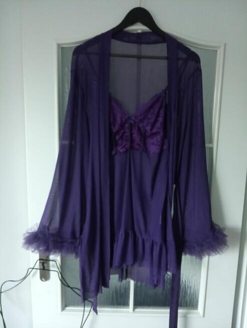 Piękny, zwiewny komplet szlafroka z koszulka w oryginalnym, zmysłowym fioletowym odcieniu. Nowy. Wysyłka paczką pocztową ...