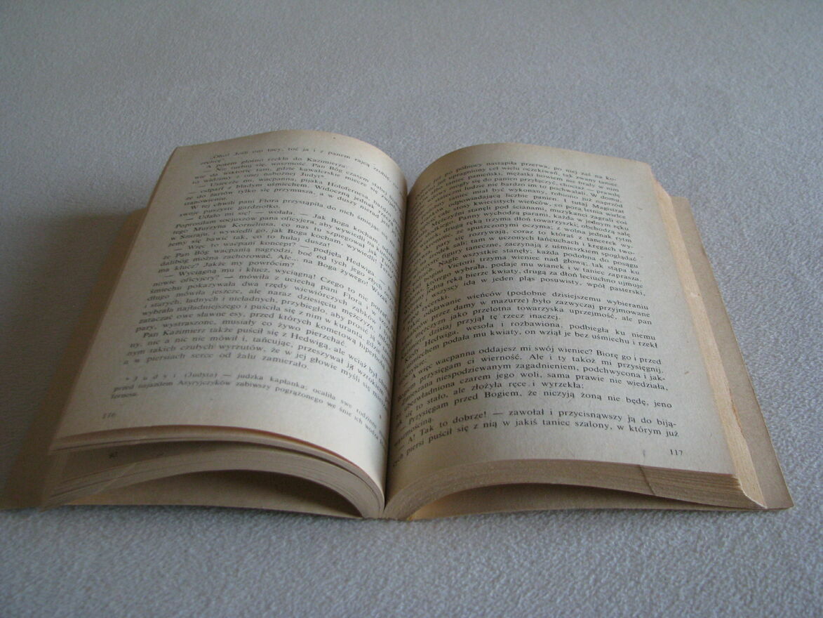 Książka z prywatnych zbiorów, od nowości „w jednych rękach”, przechowywana na regale w mieszkaniu. Jak na swój wiek jest w stanie idealnym, bez zagnieceń, zapisków, podkreśleń, stempli itp. Jest kompletna, nie rozpada się, strony czytelne, bez zagięć, plam i nieprzyjemnych zapachów. Książka bardzo zadbana, niemniej widoczny jest upływ czasu w postaci pociemniałych stron.