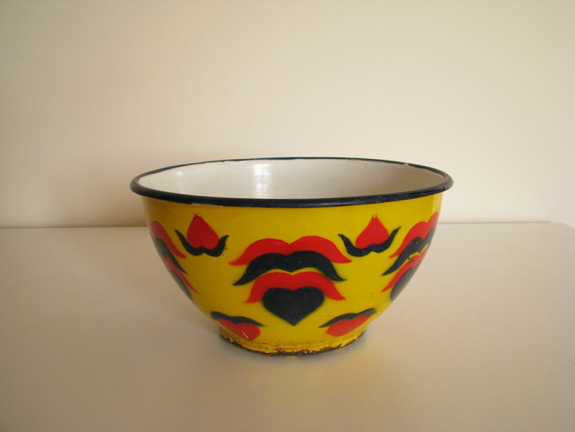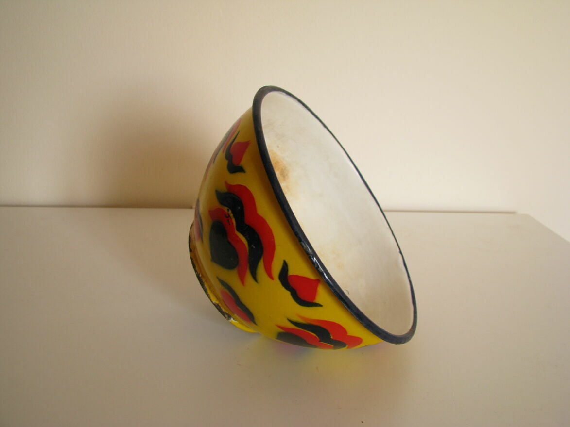 Miska o ciekawym kształcie z czarnym rantem, od zewnątrz pokryta jest żółtą emalią i naniesionymi granatowo czerwonymi wzorami. Od wewnątrz miska pokryta jest białą emalią.