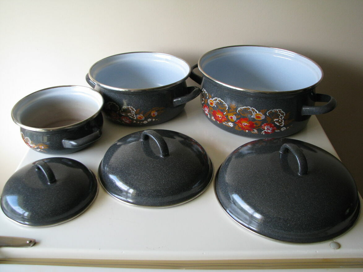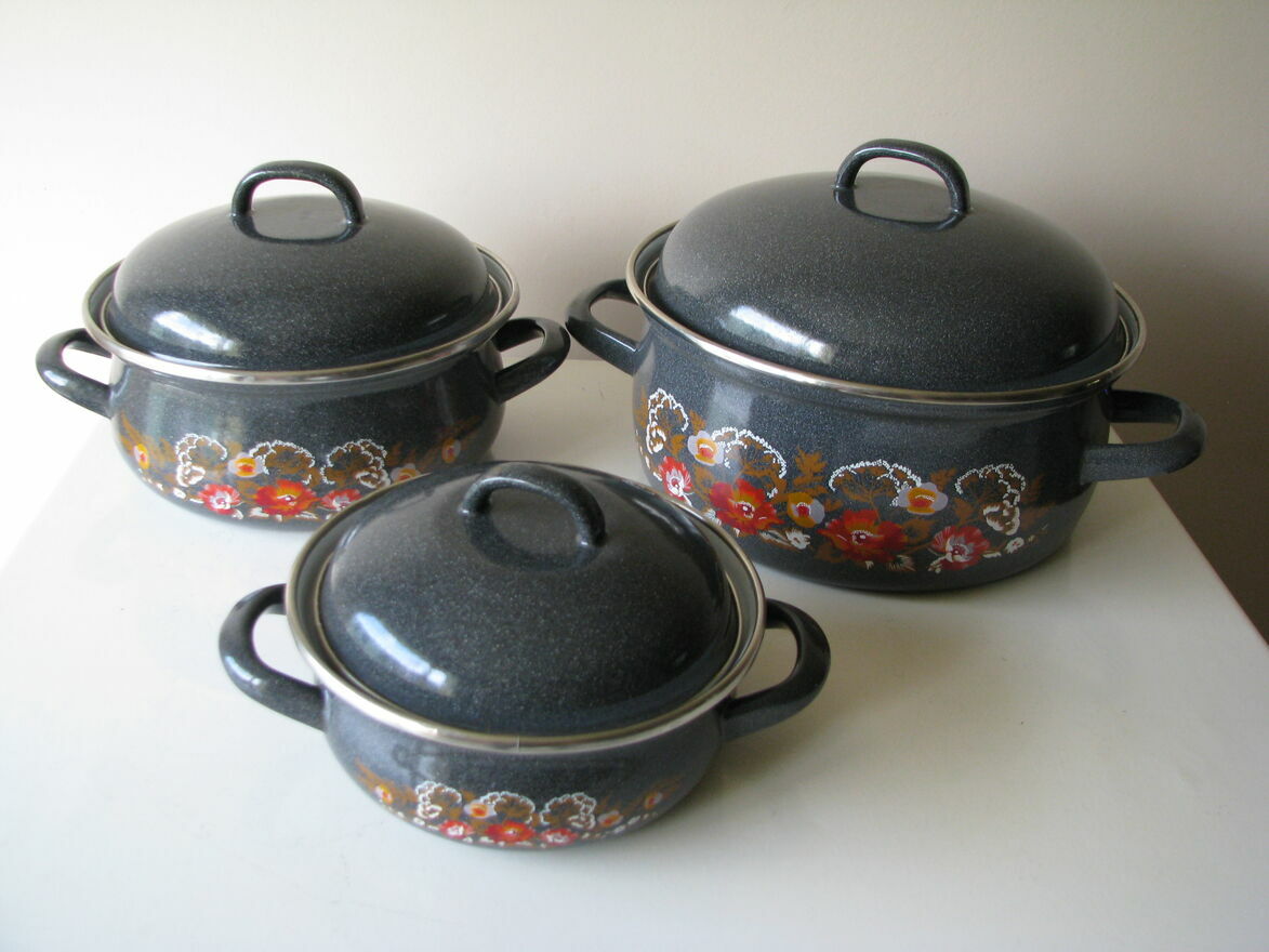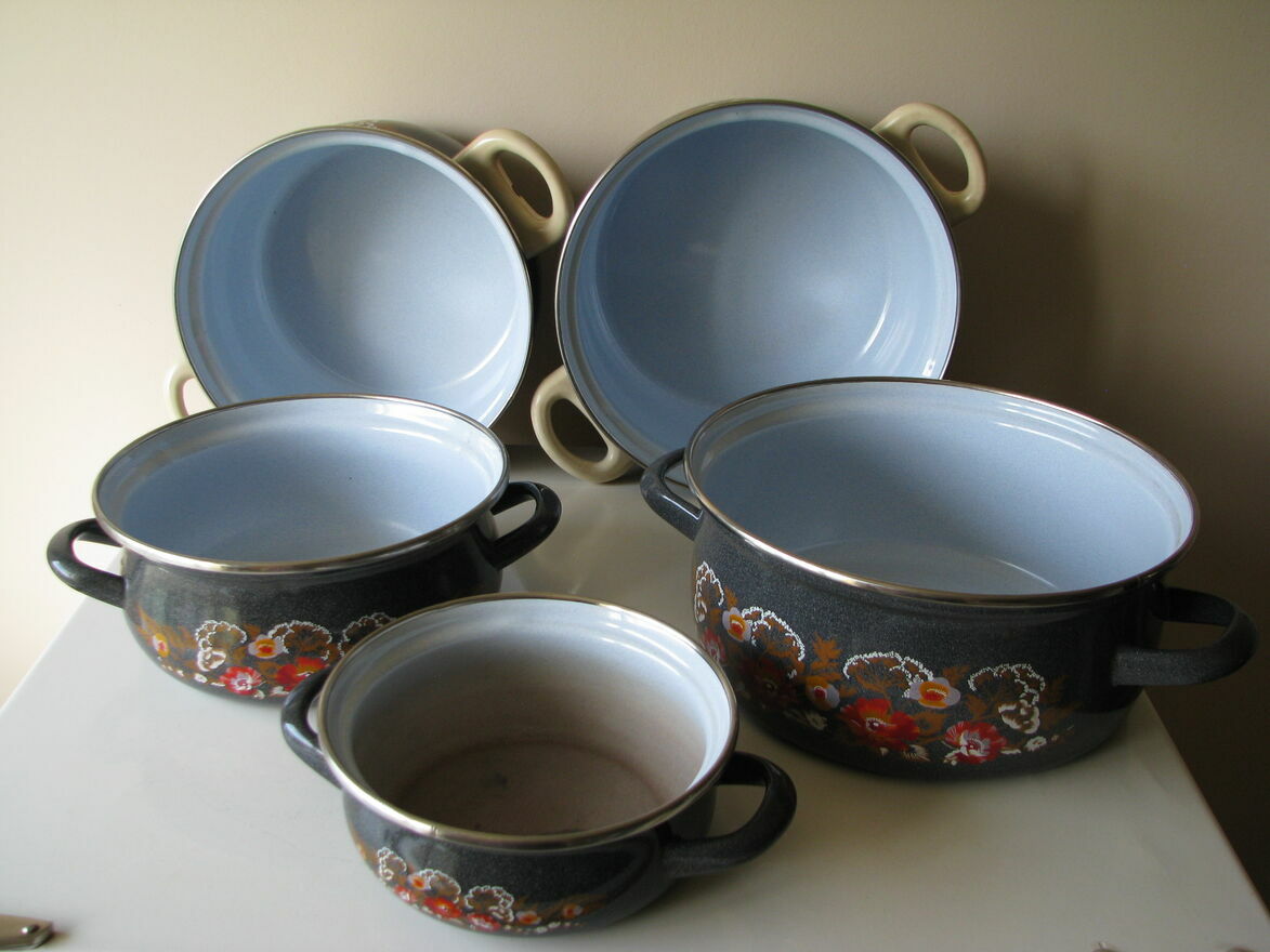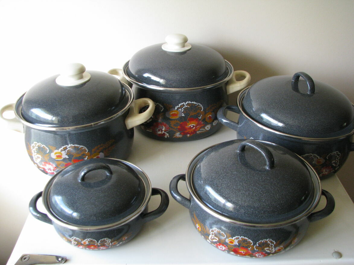 Witam,Sprzedam komplet 5 emaliowanych garnków do gotowania, w różnych rozmiarach wraz z pokrywkami w kolorze ciemnego, nakrapianego grafitu z motywem kwiatowym, od wewnątrz jasno-niebieskim.