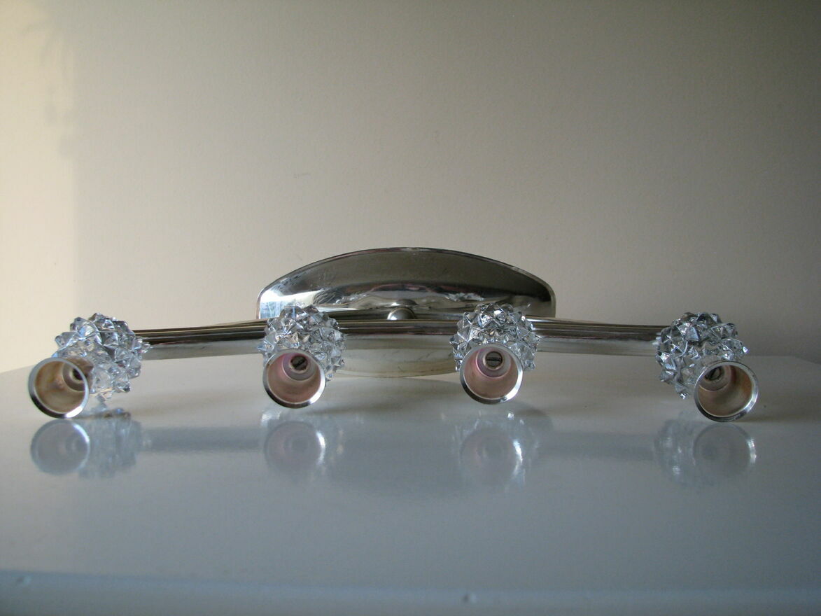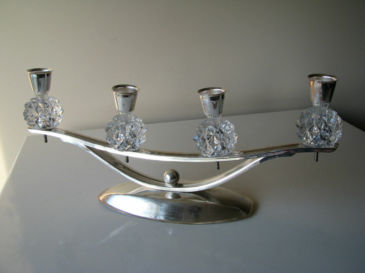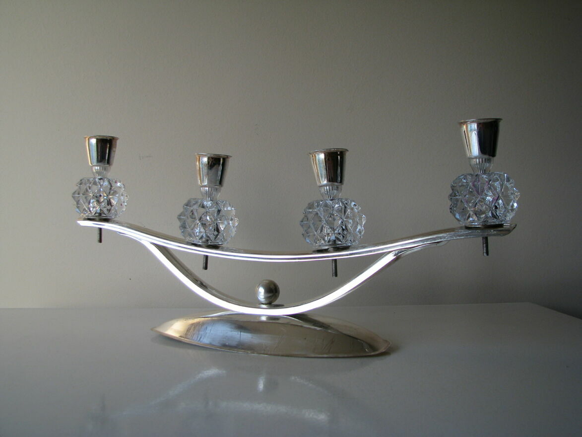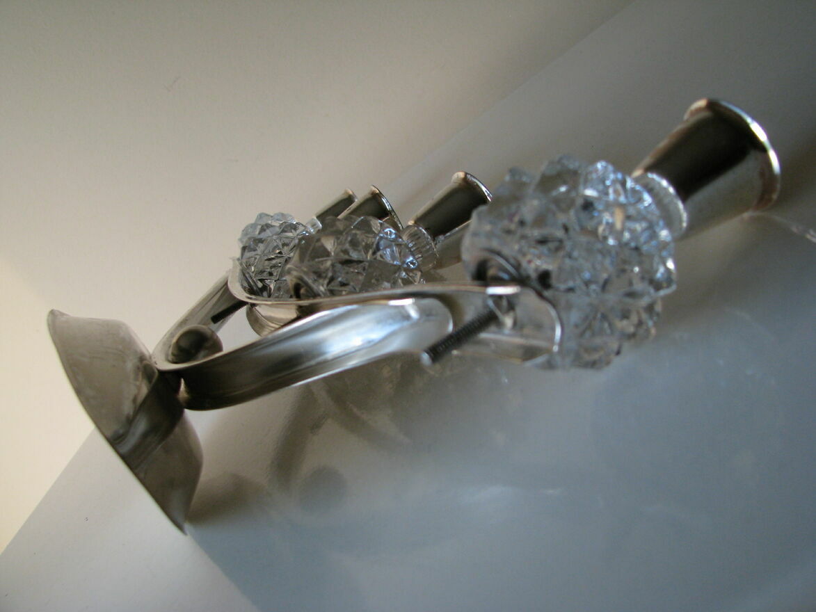 Świecznik w srebrnym kolorze, o wydłużonym kształcie z kryształowymi, karbowanymi kulami, zakończonymi metalowymi uchwytami na świece o średnicy do 2,5 cm.