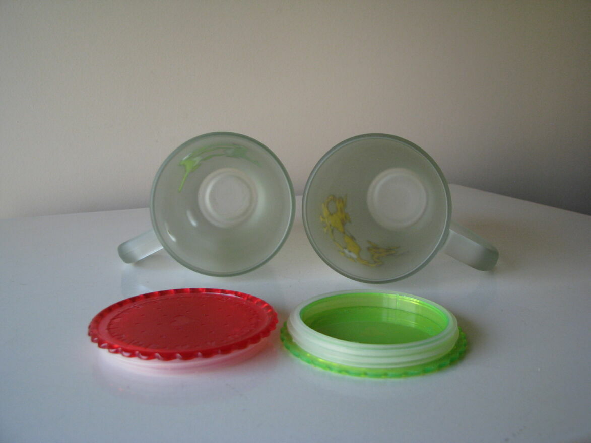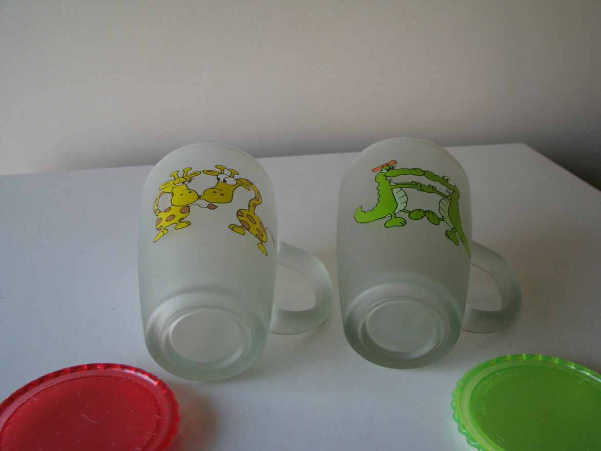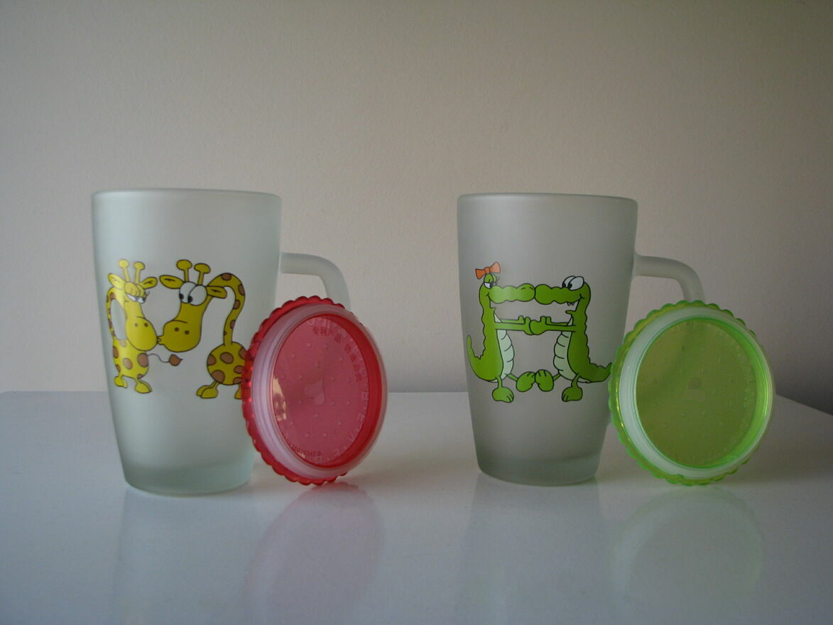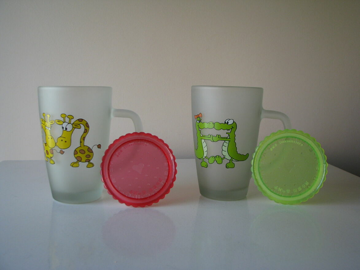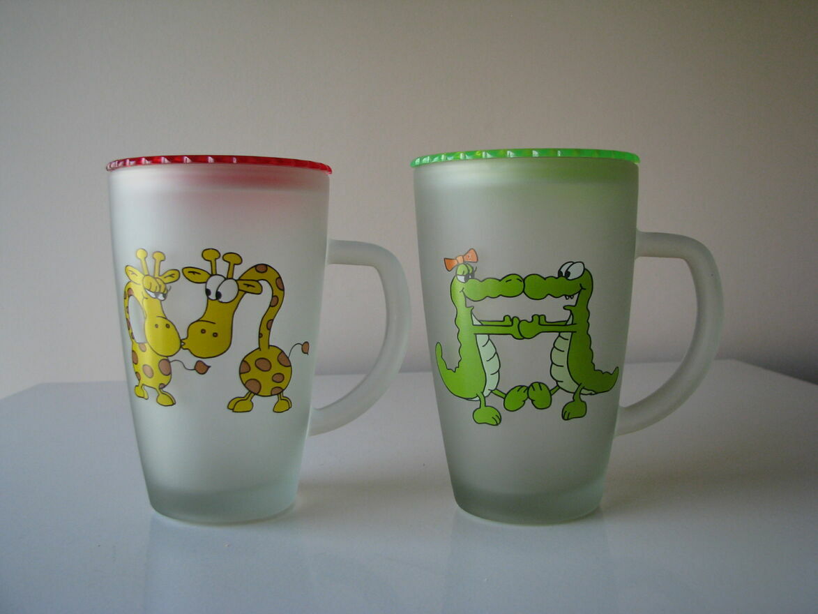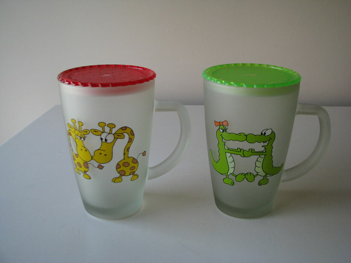 Witam,Sprzedam dwie urocze szklanki - kubki ze zmatowionego / szronionego szkła z pokrywkami z nadrukiem zakochanych zwierzaków.