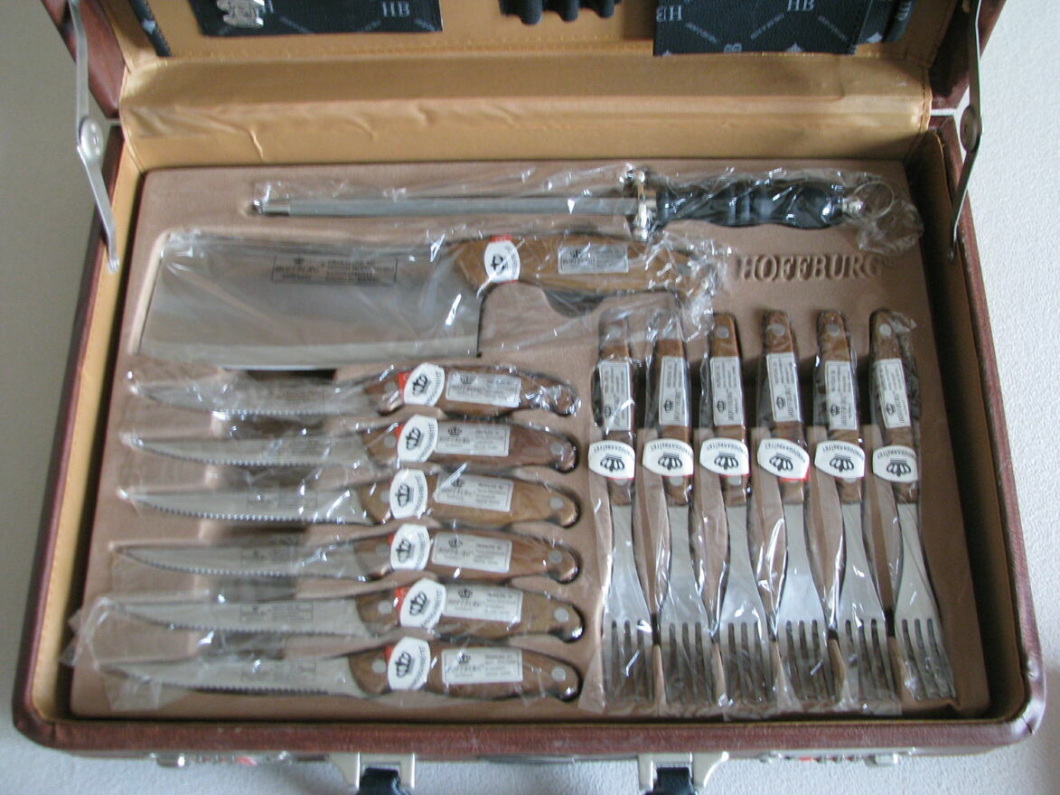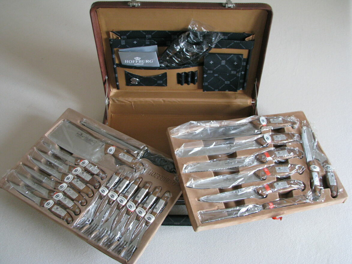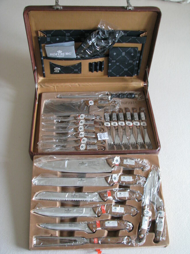 Witam,Sprzedam elegancki, 24 częściowy, kuchenny zestaw sztućców i przyborów do steków i profesjonalnego grillowania austriackiej marki Hoffburg specjalizującej się w produkcji wysokiej jakości sztućców oraz akcesoriów stołowych z nierdzewnej stali szlachetnej klasy Premium.