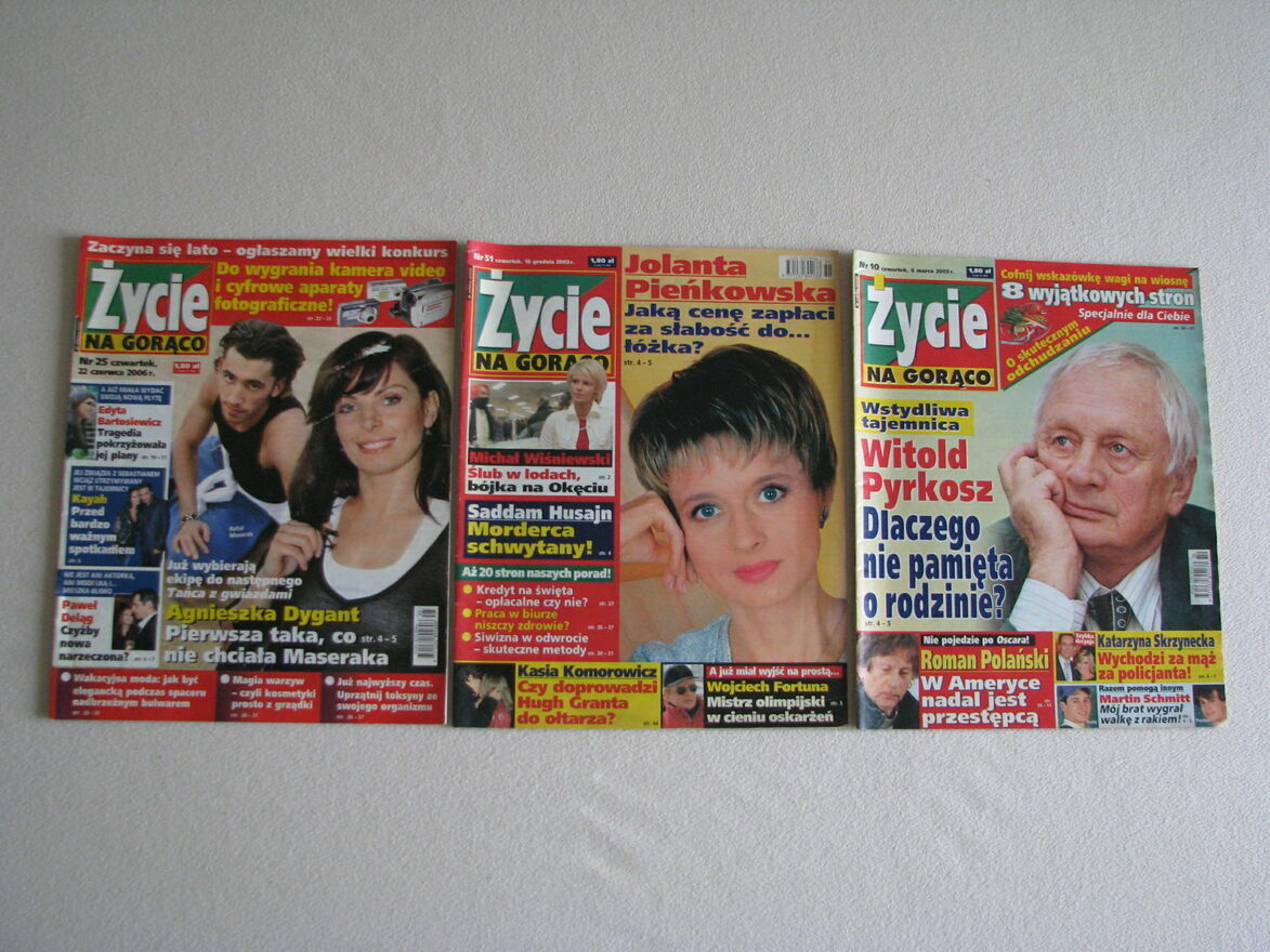 Witam,Sprzedam 3 egzemplarze archiwalnych wydań tygodnika Życie na gorąco z lat 2003 i 2006, w formacie 23 x 29 cm, zawierających każde po 49 stron.